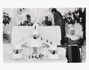 أم العريس تعمل كحارسة لكعك الزفاف في إحدى الأعراس الفلسطينية.